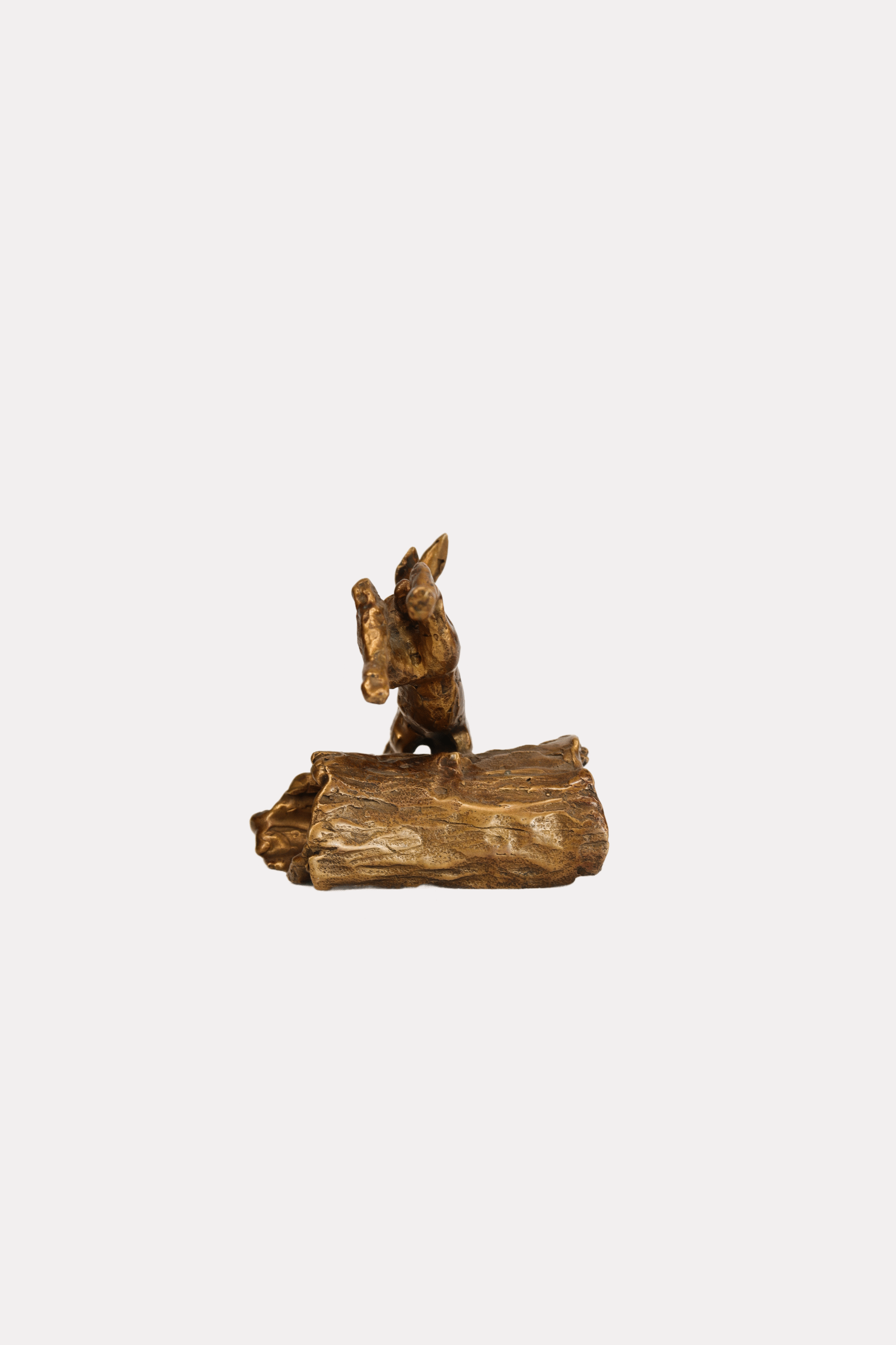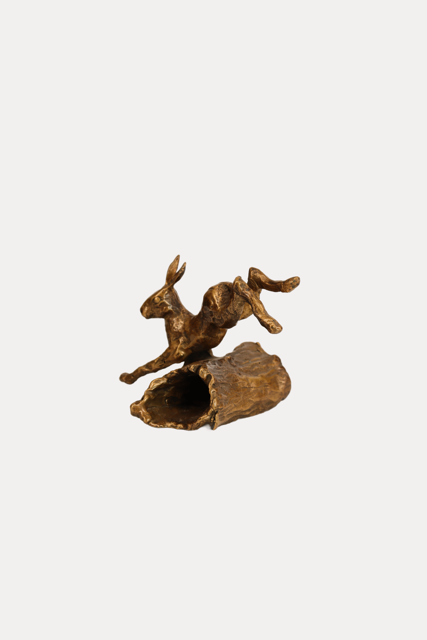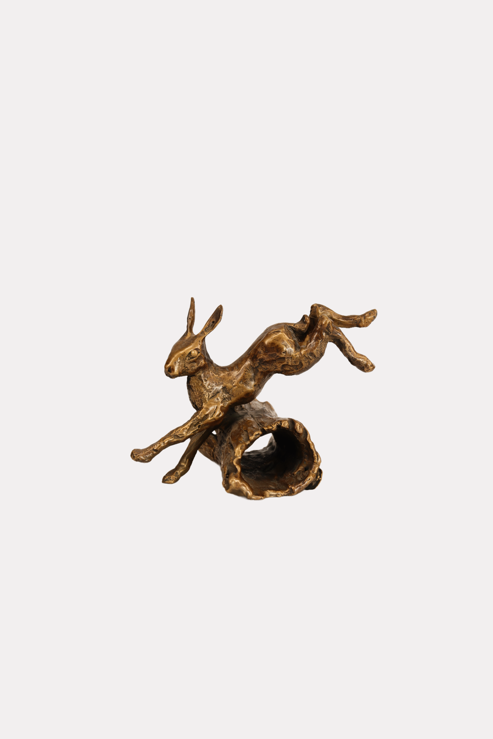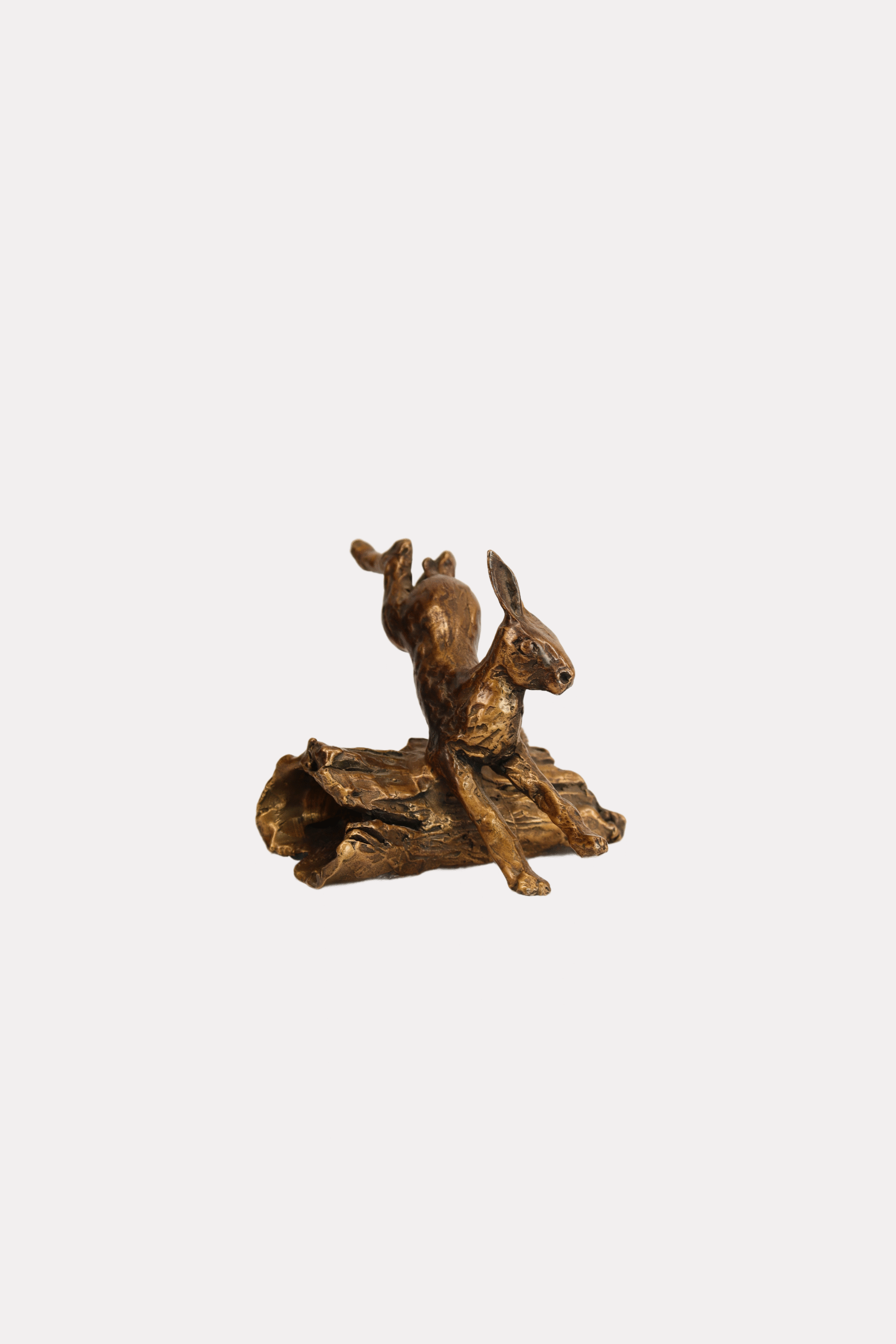 The bronze sculpture depicting a hare is a unique and practical gift for a hunter, made with attention to detail. The hare is shown in a dynamic pose, with its paws raised, as if in the process of jumping, which captures its natural agility and movement. The polished bronze surface shimmers in warm shades of bronze and gold, with the textures of its fur and muscles visible, adding to its realistic character. The sculpture is set on a simple black pedestal, which provides stability and accentuates its form.