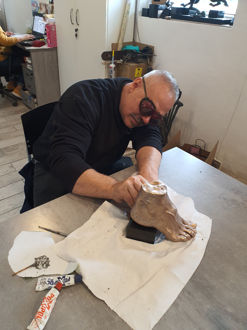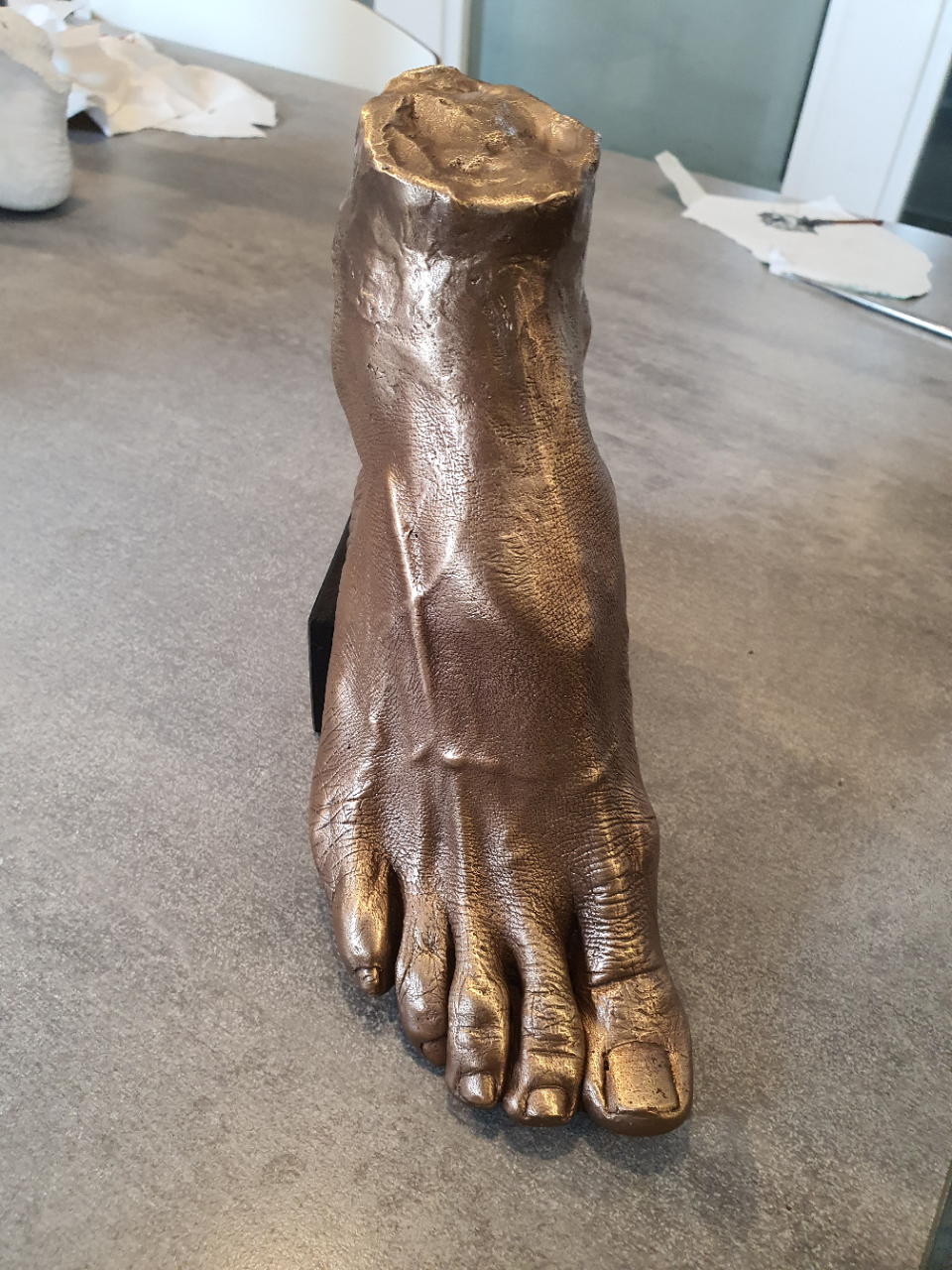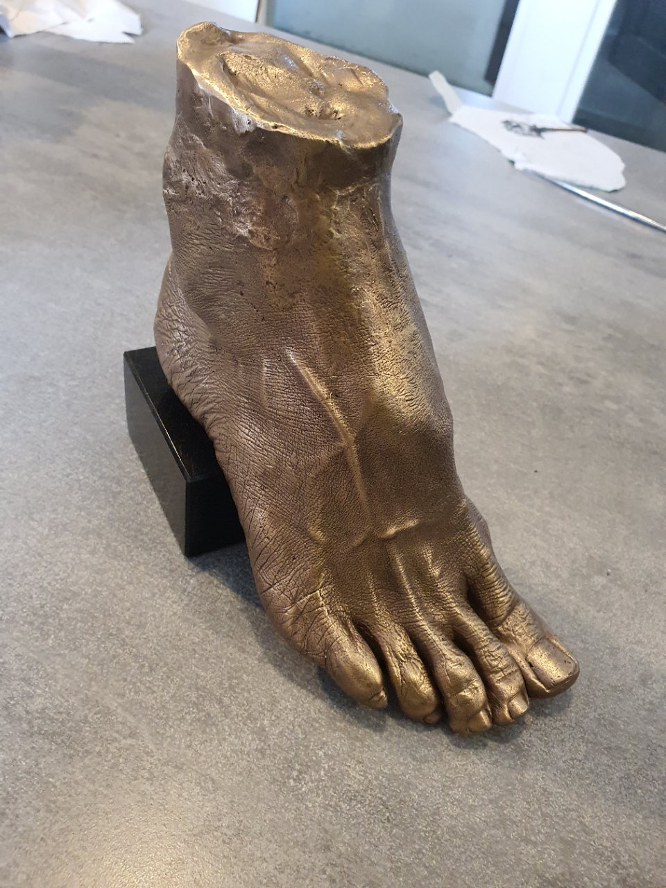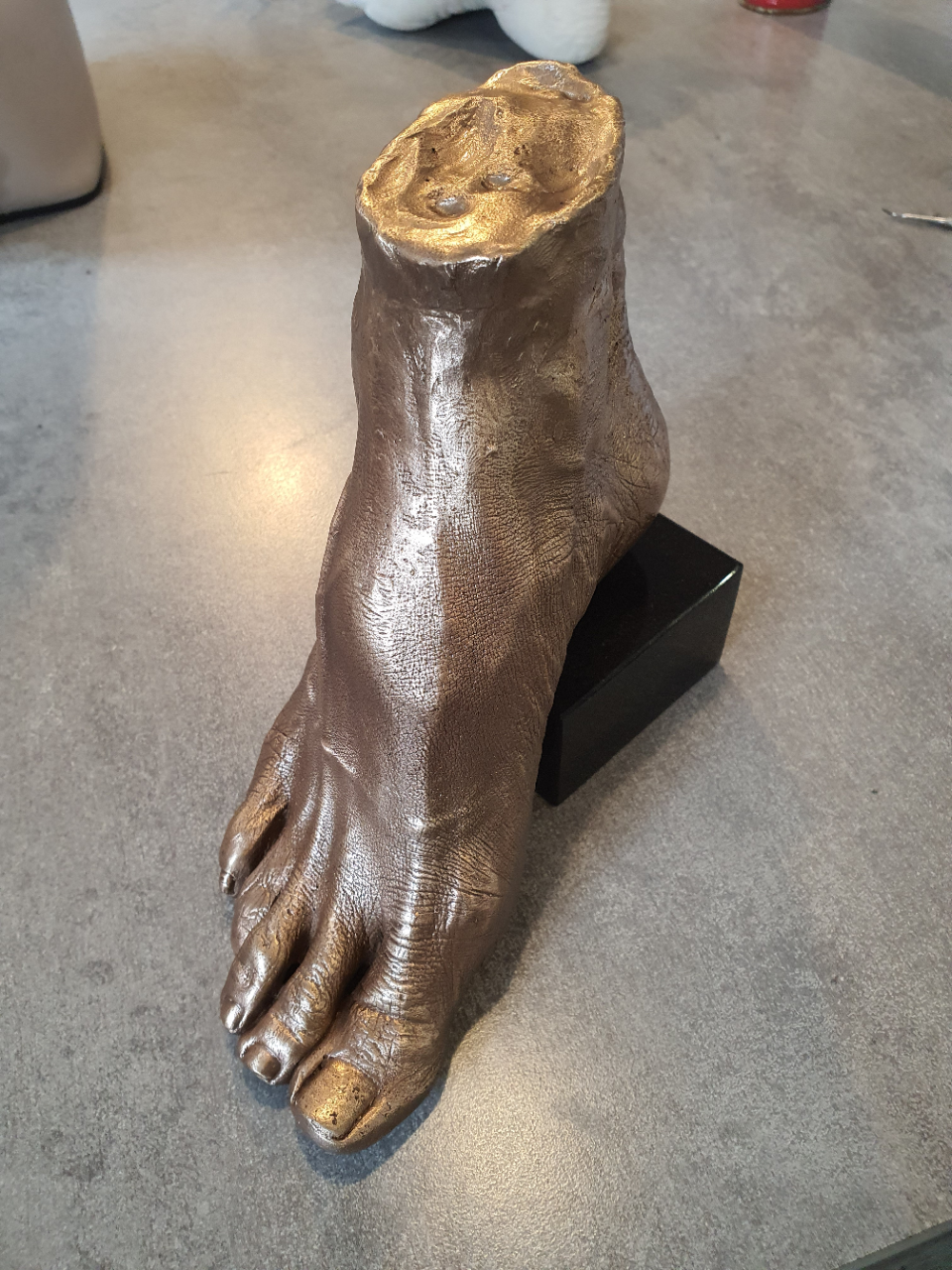 Spouse’s foot cast in bronze as a gift for her husband. A remarkable gift. The realization came out beautifully. We can make any of these realizations for you. The hand or foot of a small child, the foot or hand of a spouse or the torso of a husband.