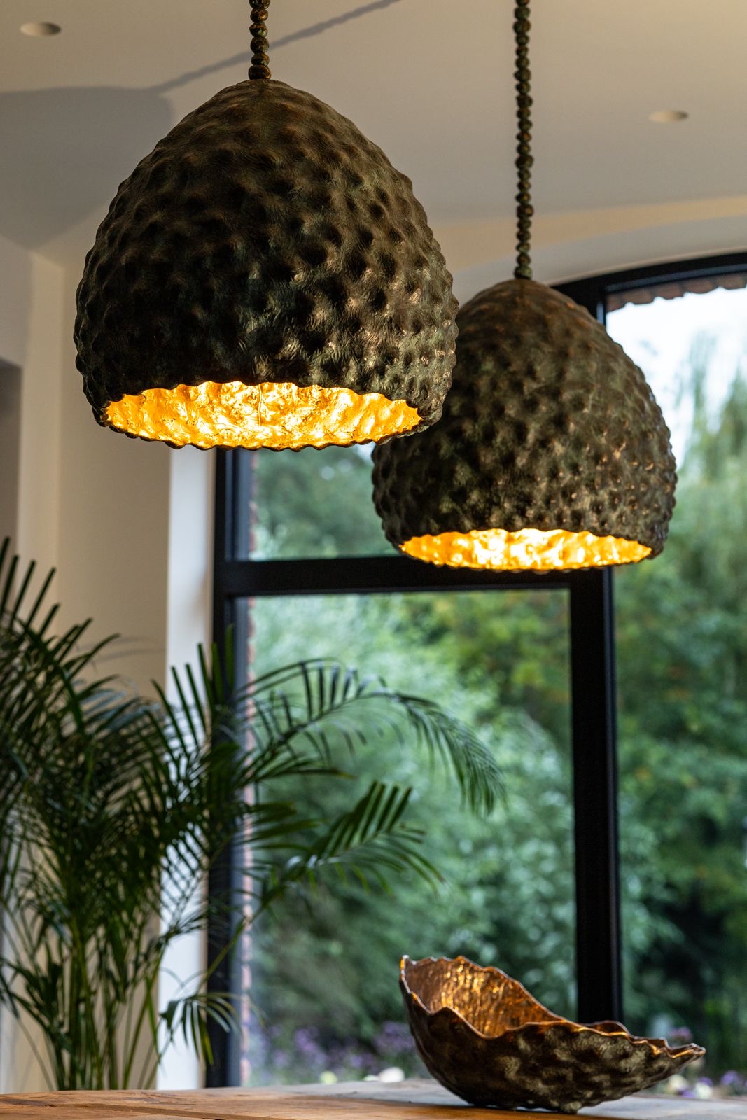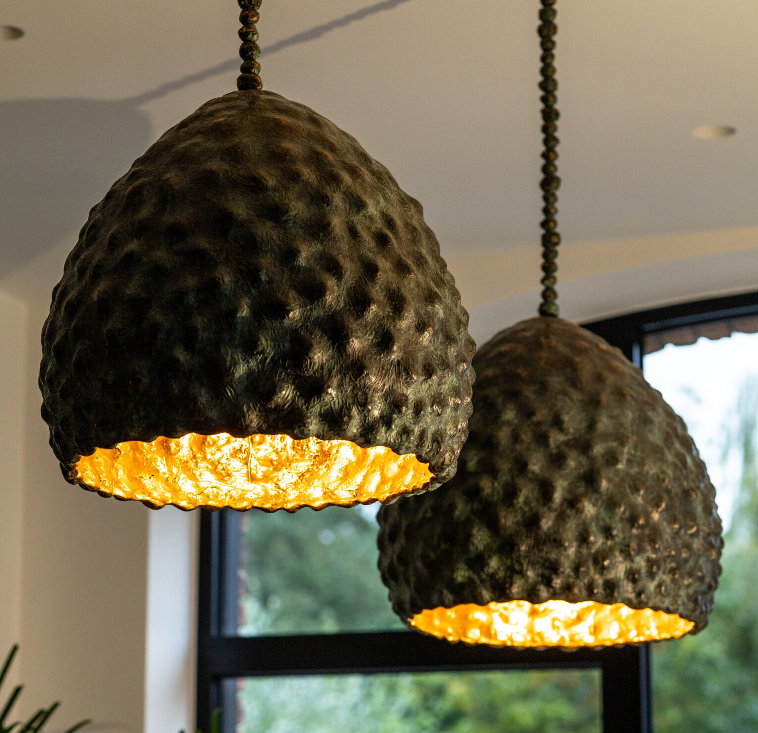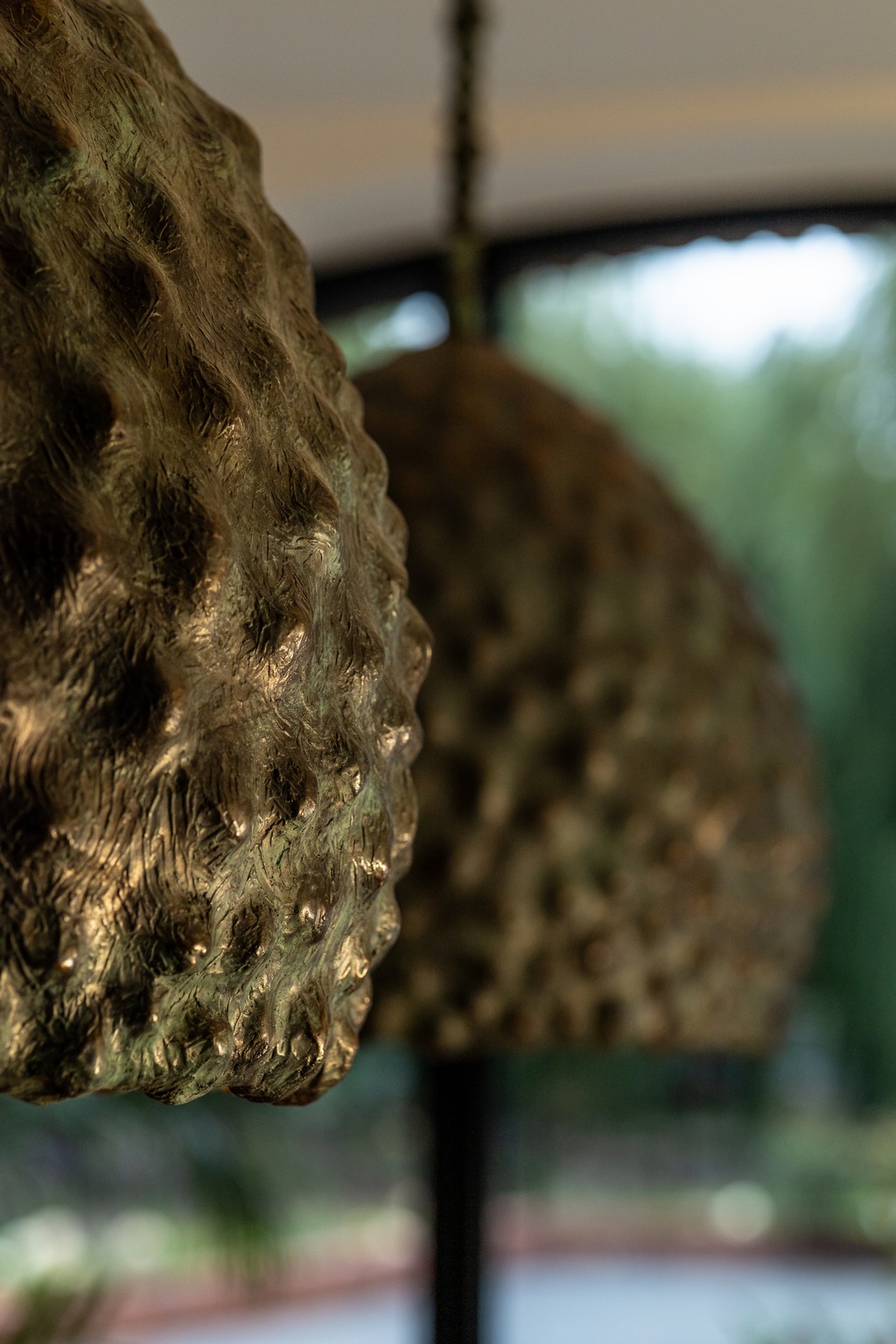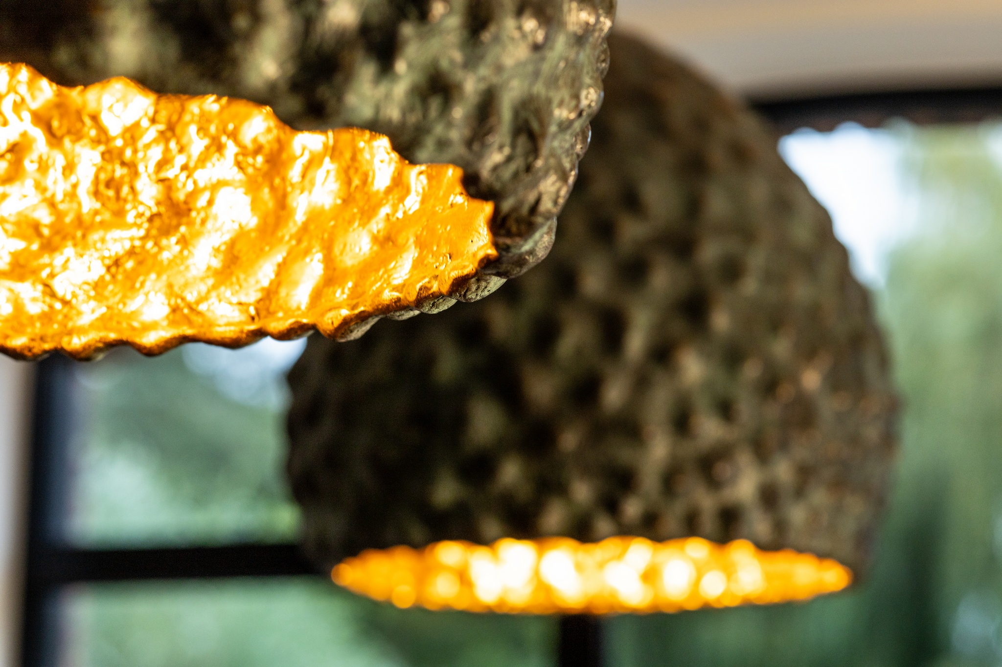 Jej masywna, organiczna forma inspirowana naturą przypomina pancerz lub owoc – z zewnątrz surowa, strukturalna, niemal rzeźbiarska. Wnętrze lampy zaskakuje natomiast złotym wykończeniem, które odbija światło w ciepłych, migoczących tonach.