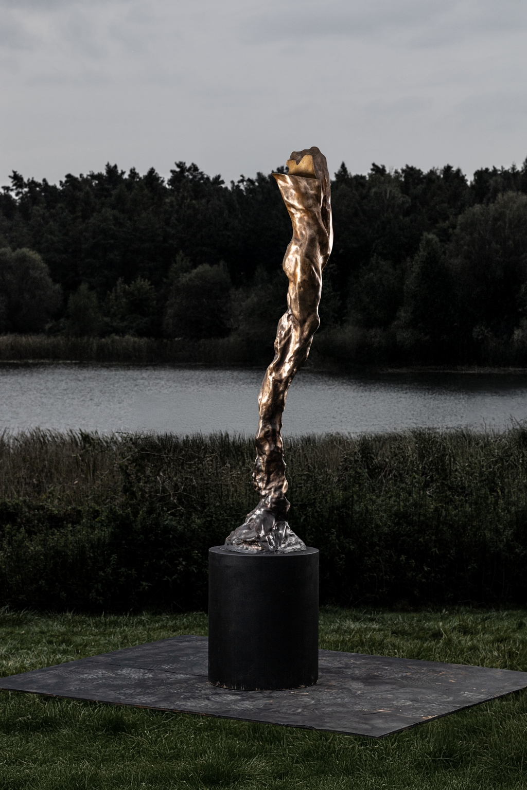 Całkowita wysokość rzeźby 200cm. Wysokość rzeźby z brązu 150cm.